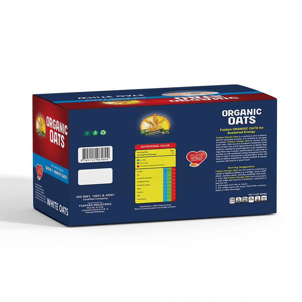 Fasfars Organic Oats 12 Sachets, 45gms brings nutritious goodness to your breakfast table with its healthy pouch made with 100% whole grain. Easy and quick to make, you can have a bowl full of richness, texture, and taste on your table in just 1 minute. It does not include any artificial flavors or preservatives. These organic oats are also low in saturated fat and cholesterol, reducing the risk of heart disease. You can have it hot as your breakfast or keep it overnight for a room-temperature meal in the morning. With its organic texture, soluble fiber, and multiple health benefits, it becomes an elevating boost of energy that lasts throughout the day.