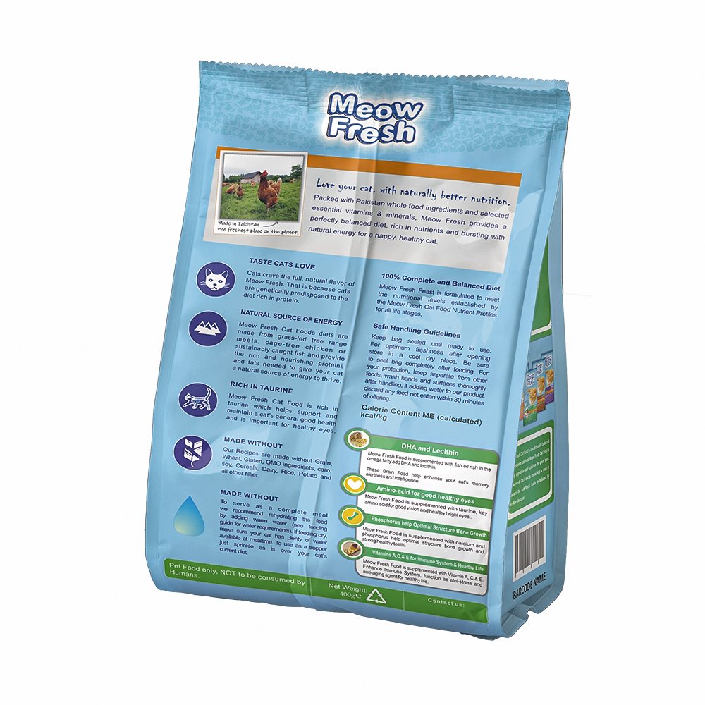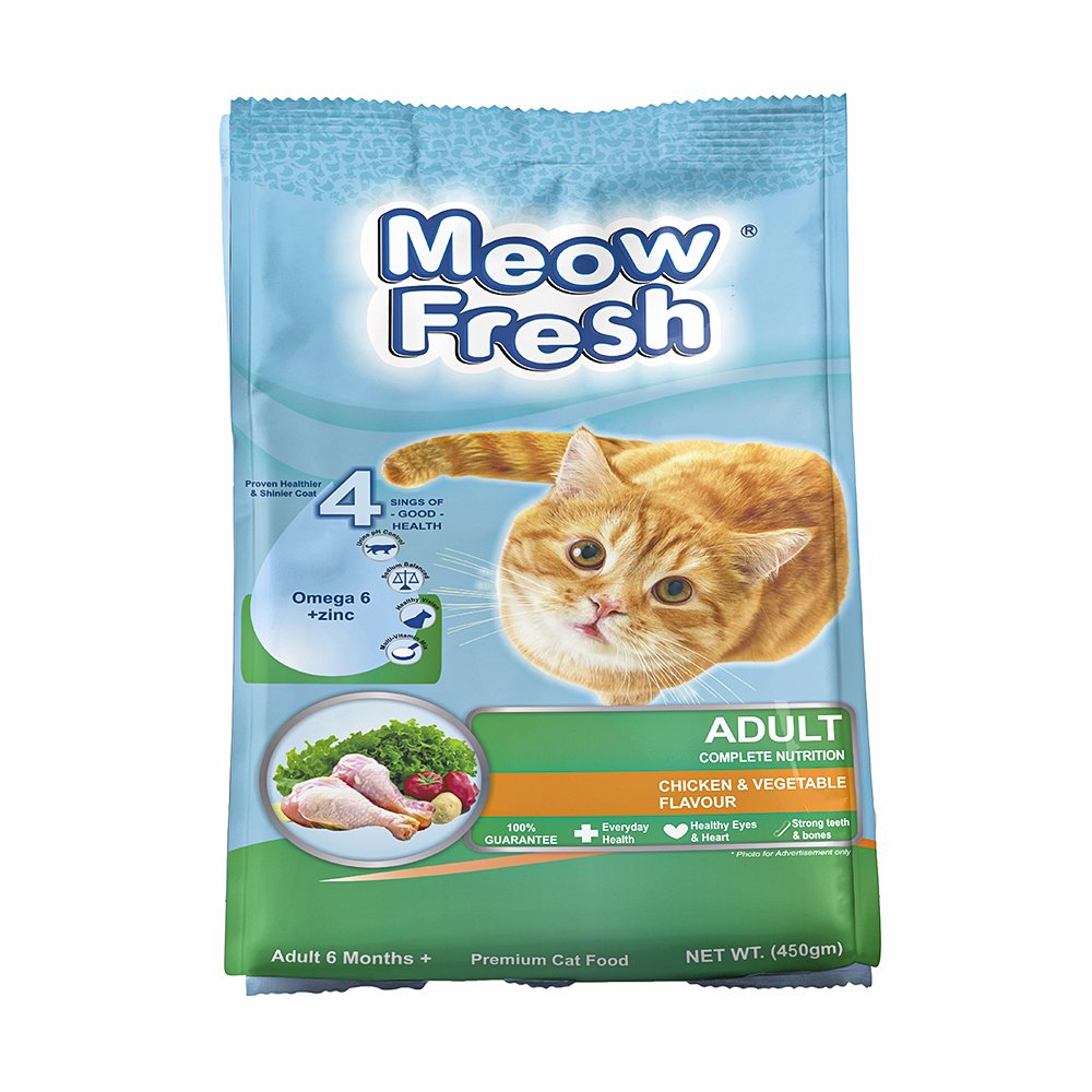 Meow Fresh Adult Chicken & Vegetable 450gm is a succulent and wholesome cat food packed with real chicken and veggies. This formula is loaded with vital nutrients to help keep your cat healthy and active and is devoid of artificial flavors, colors, and preservatives. The meal is an excellent source of moisture, vital for cats to maintain their body fluid balance. Choose this wholesome meal to give your feline friend a filling and delectable supper that will keep them healthy, content, and purring.