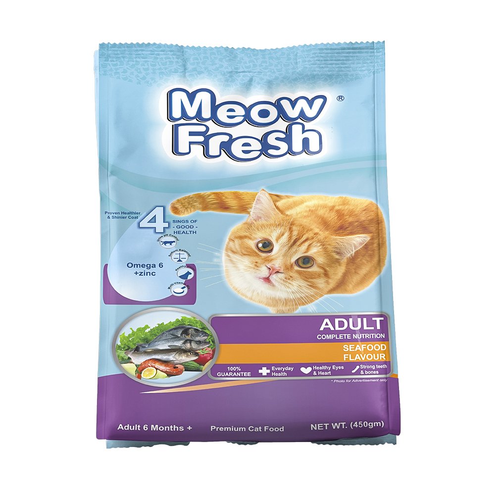 Meow Fresh Adult Seafood 450gm is a premium cat food made especially for adult cats. It has a delicious combination of premium seafood flavors that makes your cat purr with joy. Each bite is packed with the mouthwatering flavor of the ocean, giving your beloved pet a wholesome and well-balanced meal. The food is formulated to maintain the general health and vitality of your cat, making sure they get the essential nutrients they require to thrive. Giving your cat food that is both; tasty and nourishing can encourage happy and healthy living.