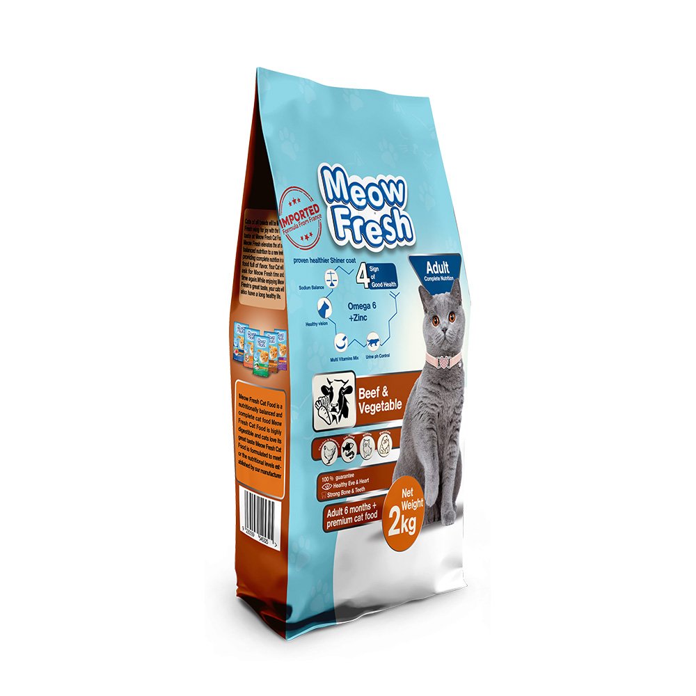 Meow Fresh Adult Beef & Vegetable 2kg is ideal to treat your feline friend with delightful favors. Each pack contains succulent beef and nutritious veggies, providing a delectable flavor that is sure to leave your cat purring with delight. Your cat receives all the vital nutrients they need to keep healthy and active in this balanced, comprehensive meal. The kibble is small and easy to chew, and contains high moisture content, keeping your cat hydrated. The meal is also a good source of fiber, which helps to support your cat’s digestive health.